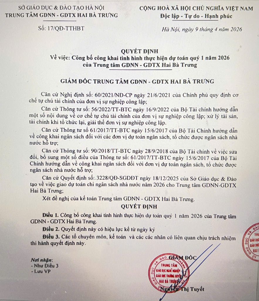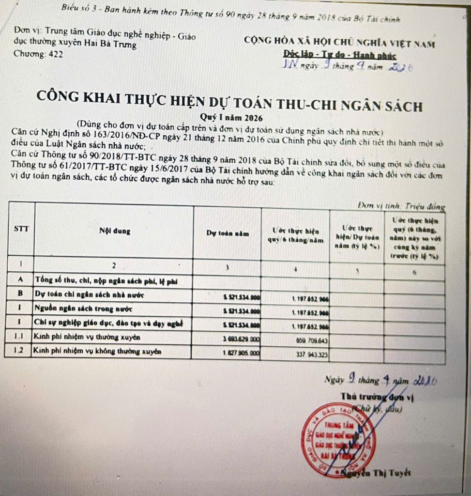 THÔNG BÁO TÌNH HÌNH DỰ TOÁN QUÝ 1/2026 CỦA TRUNG TÂM